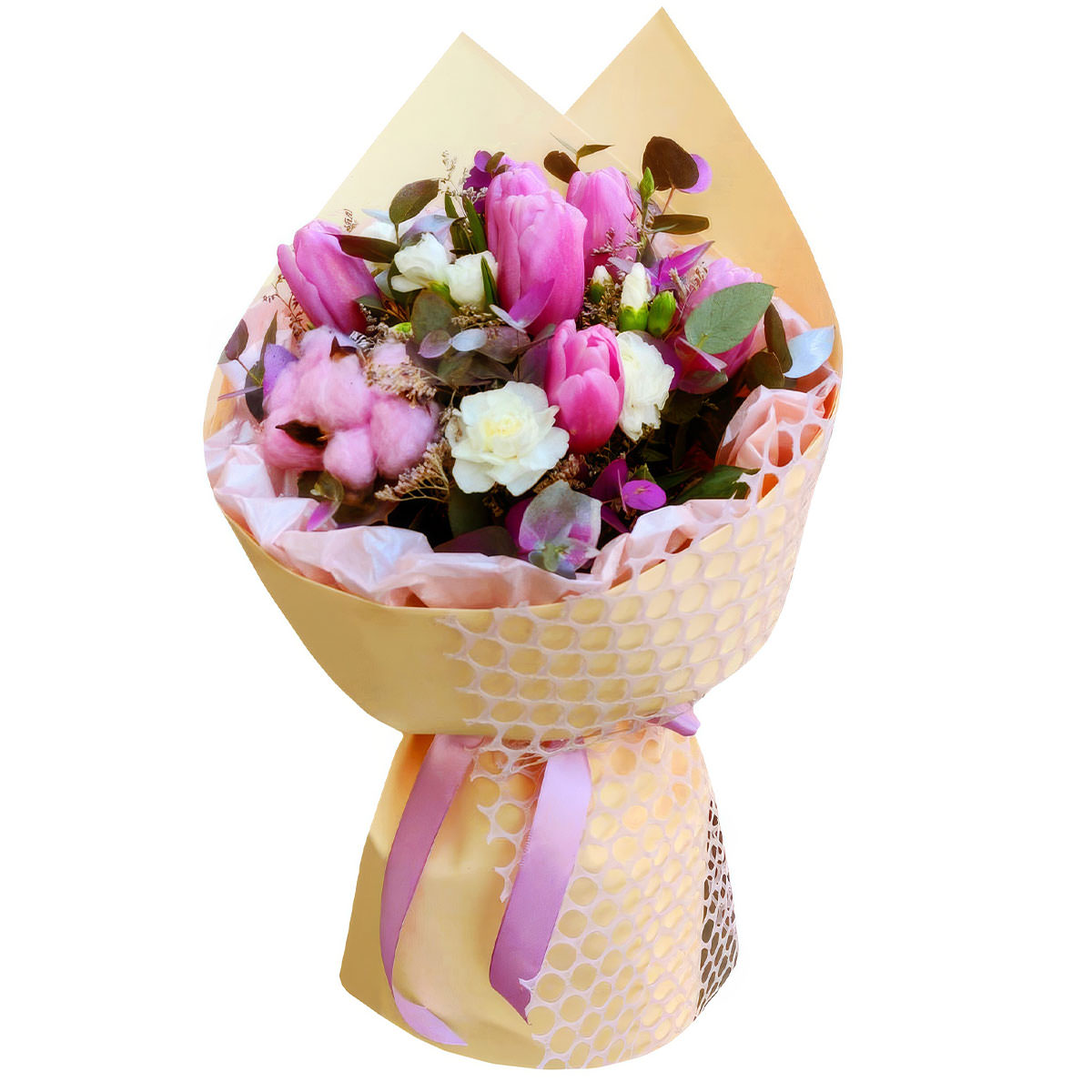 | Состав | Тюльпаны, Хлопок, Эвкалипт, Эустомы |
