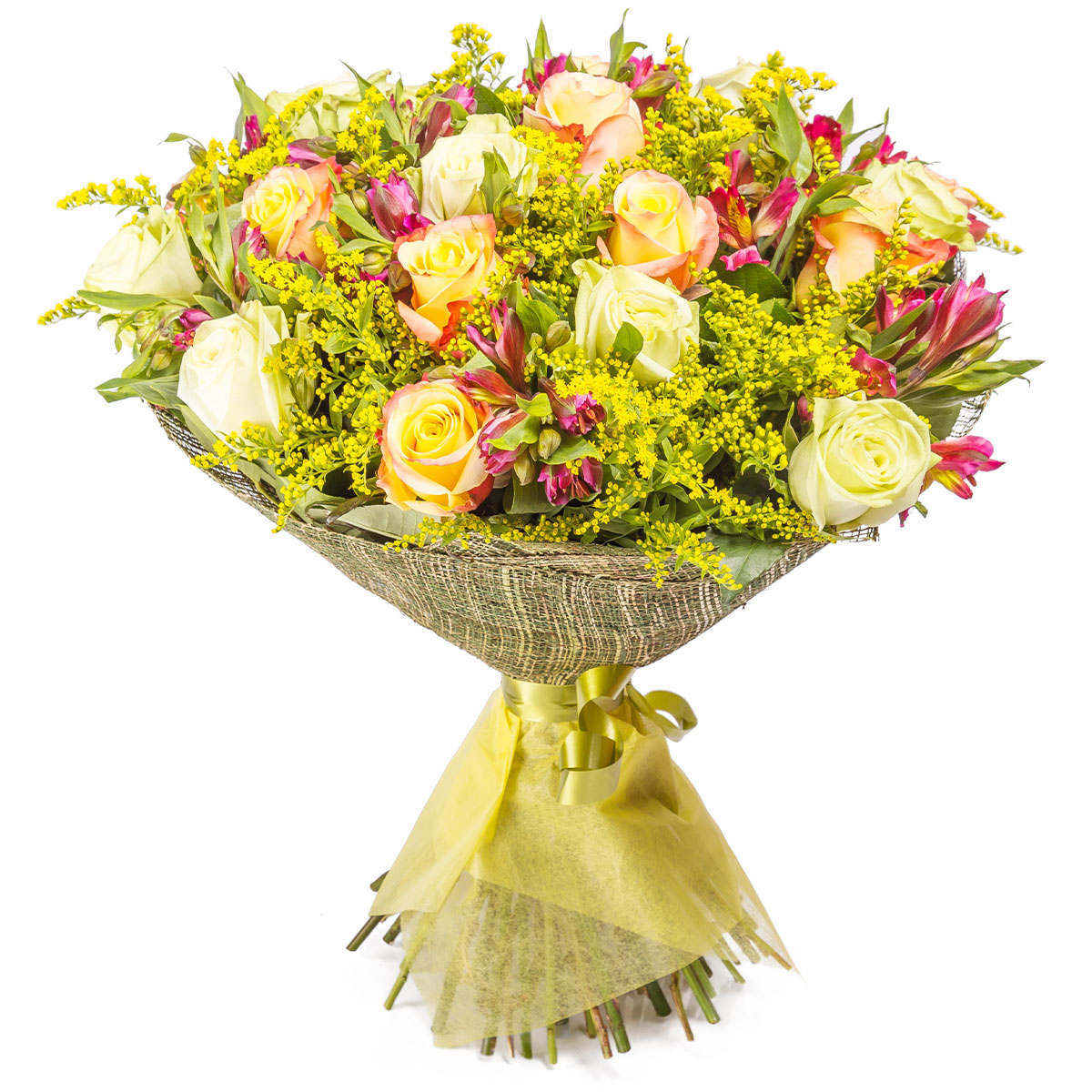 Роза одноголовая желтая, альстромерия розовая, солидаго. Упаковка (лента, пленка, крафт, сетка, пленка матовая)