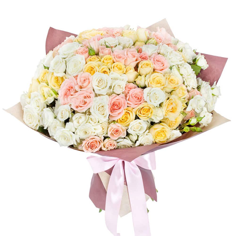 Роза кустовая микс (белая, желтая, розовая). Упаковка (лента, пленка, крафт, сетка, пленка матовая)