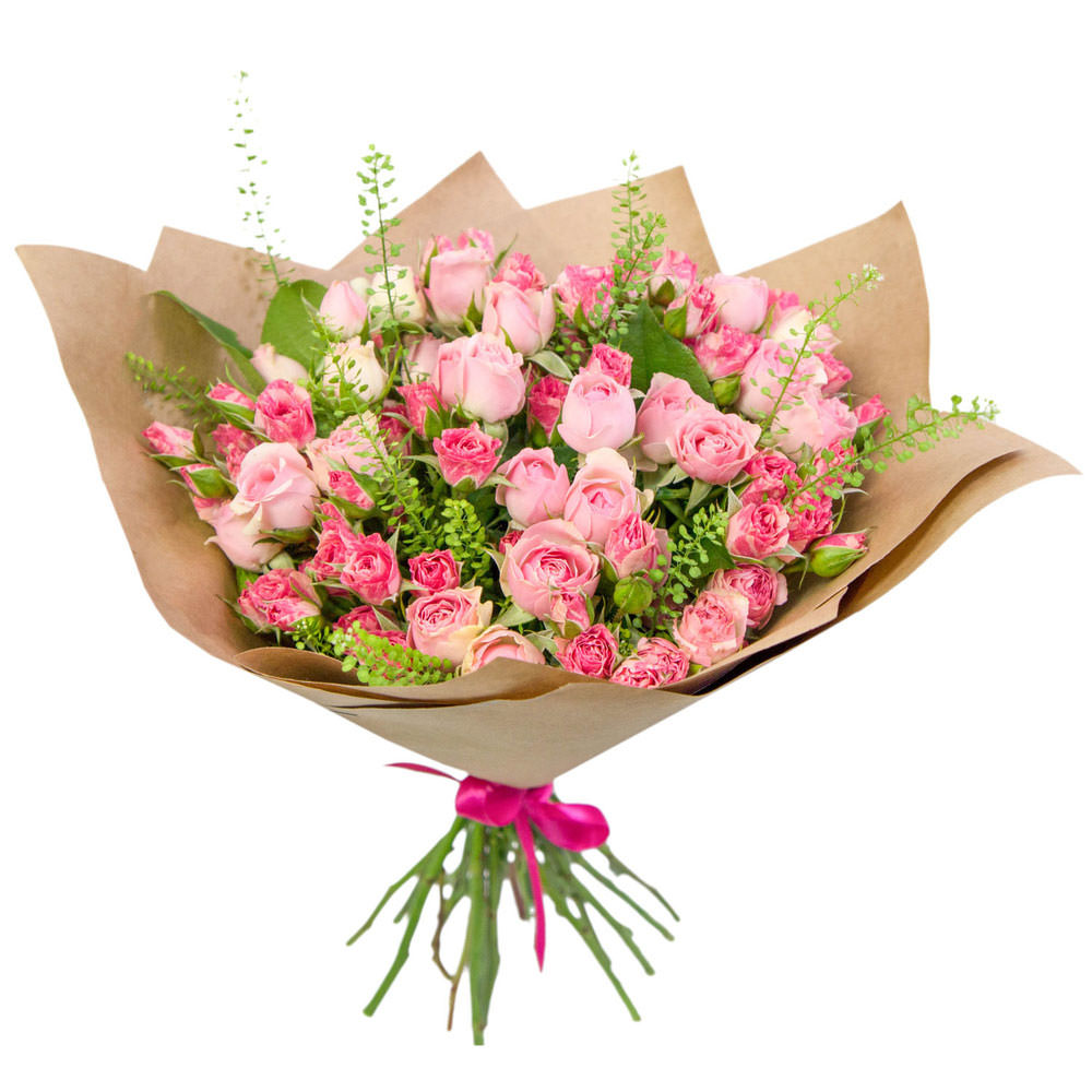 Роза кустовая розовая, тласпи. Упаковка (лента, пленка, крафт, сетка, пленка матовая)