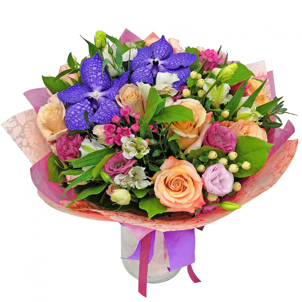 Ванда, роза одноголовая кремовая, альстромерия белая, эустома розовая, гиперикум, эвкалипт. Упаковка (лента, пленка, крафт, сетка, пленка матовая)