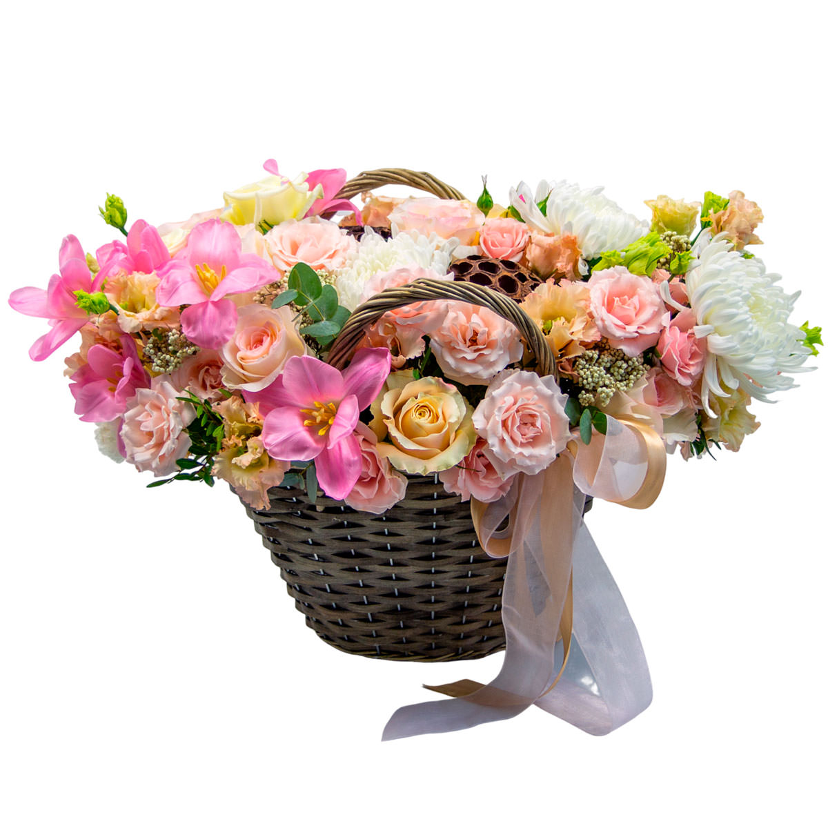 Роза кустовая желтая и розовая, эустома розовая и персиковая, тюльпан розовый, хризантема одноголовая белая, лотос. Упаковка (Корзина, оазис, ящик).