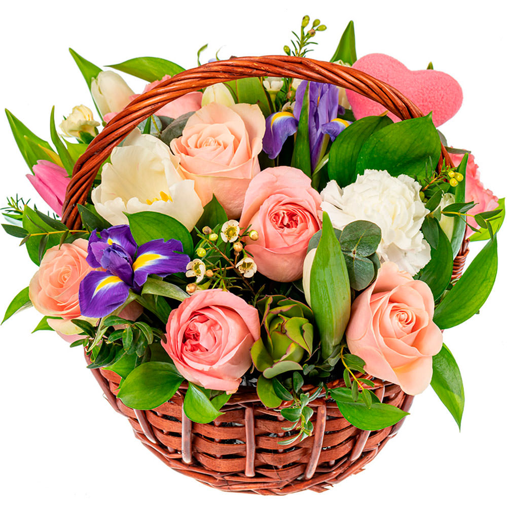 Роза одноголовая розовая, ирис, тюльпан белый, гвоздика белая, ваксфлауэр, фисташка, зелень. Упаковка (Корзина, оазис).