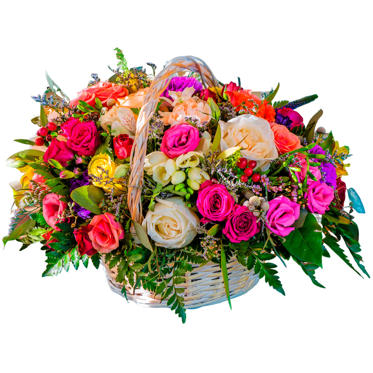 Роза одноголовая кремовая, роза кустовая розовая, эустома розовая, фрезия белая, гиперикум, альстромерия желтая, вероника, зелень. Упаковка (Корзина, оазис, ящик).
