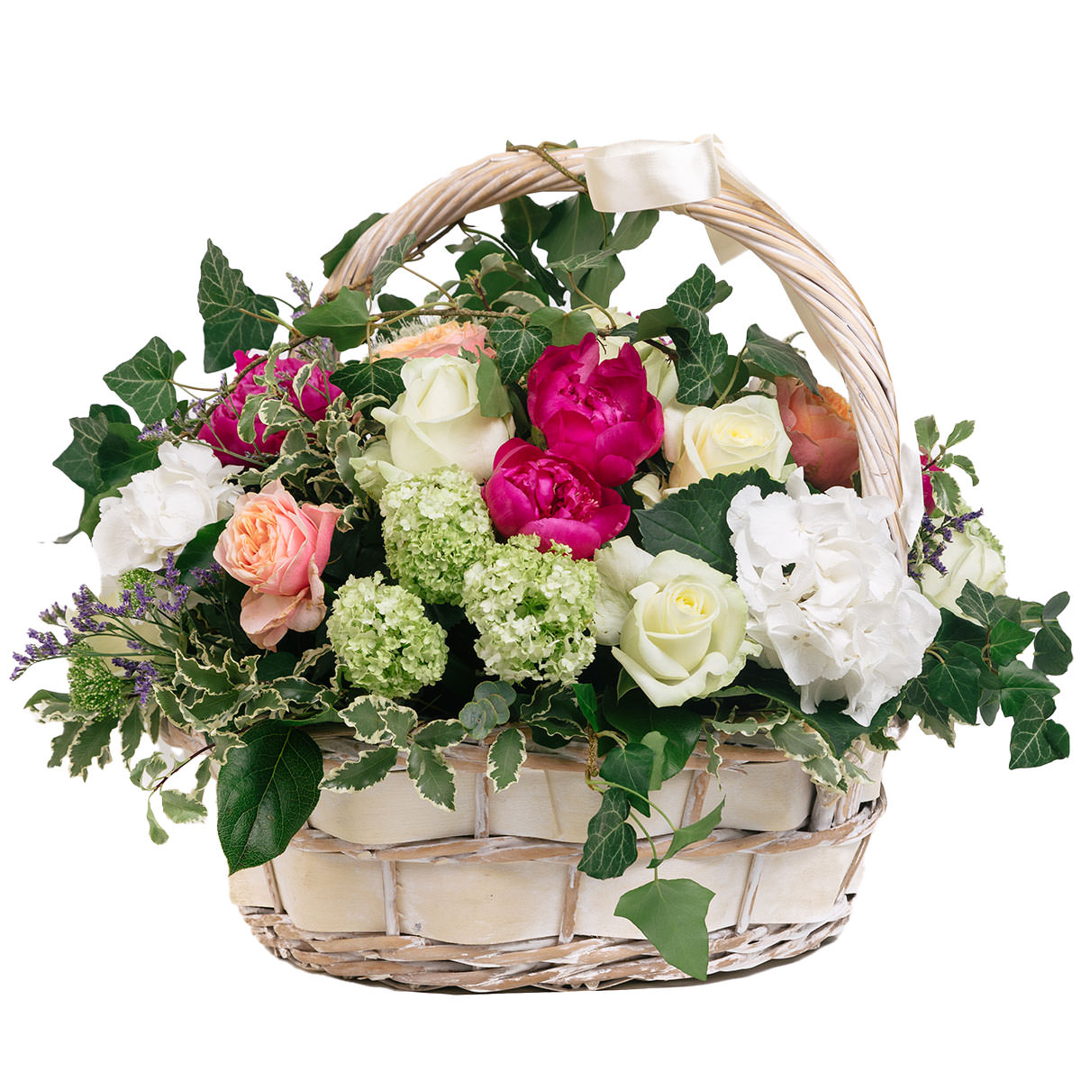 Роза одноголовая белая и персиковая, пион розовый, гортензия белая и зеленая, плющ. Упаковка (Корзина, оазис, ящик).