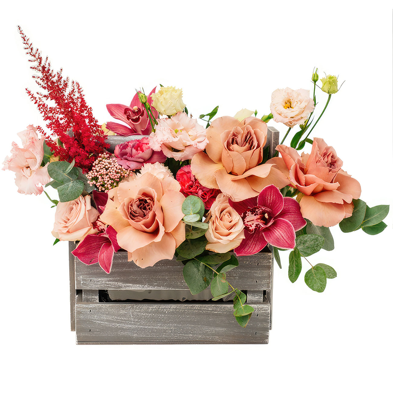 Роза одноголовая розовая, орхидея розовая, гвоздика красная, эустома кремовая, эвкалипт. Упаковка (Корзина, оазис, ящик).