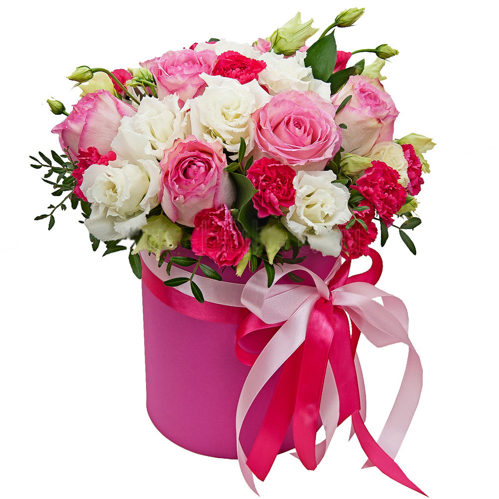 Роза одноголовая розовая, гвоздика кустовая мини розовая, эустома белая, фисташка. Упаковка (шляпная коробка, квадратный бокс, коробка сердце, оазис)