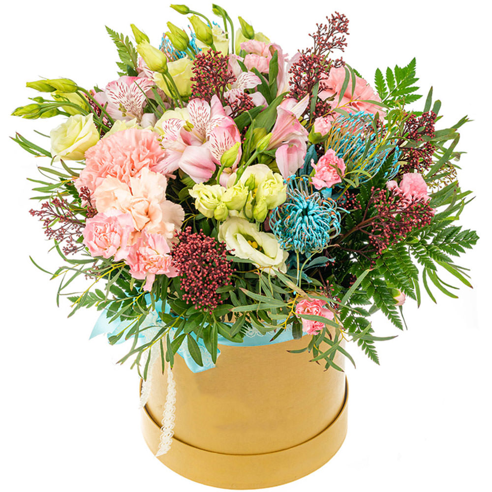 Гвоздика розовая, эустома белая, альстромерия розовая, скимия, крашенный леукоспернум, фисташка. Упаковка (шляпная коробка, квадратный бокс, коробка сердце, оазис)
