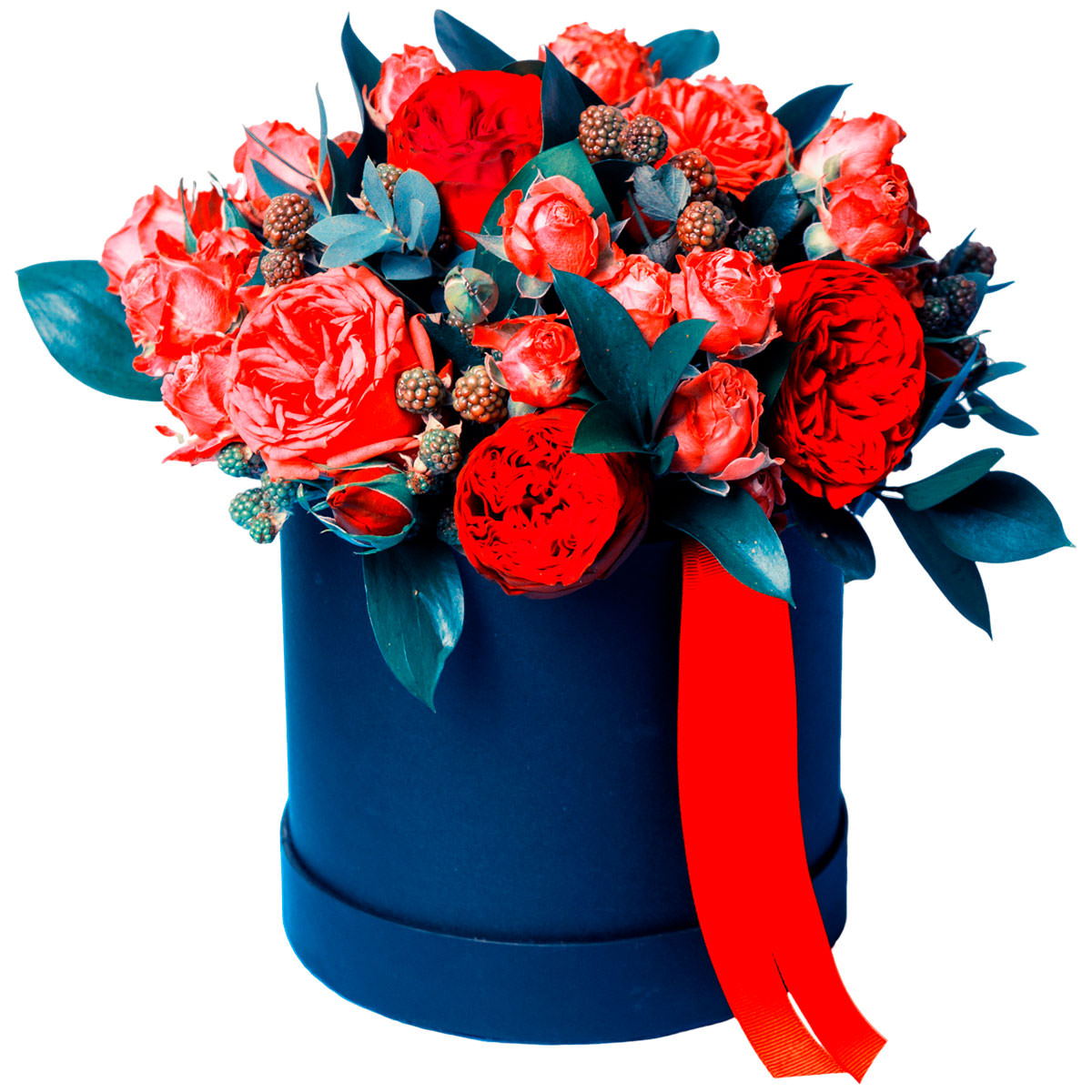 Роза пионовидная красная, роза кустовая красная, аспидистра, куст ежевики. Упаковка (шляпная коробка, квадратный бокс, коробка сердце, оазис)
