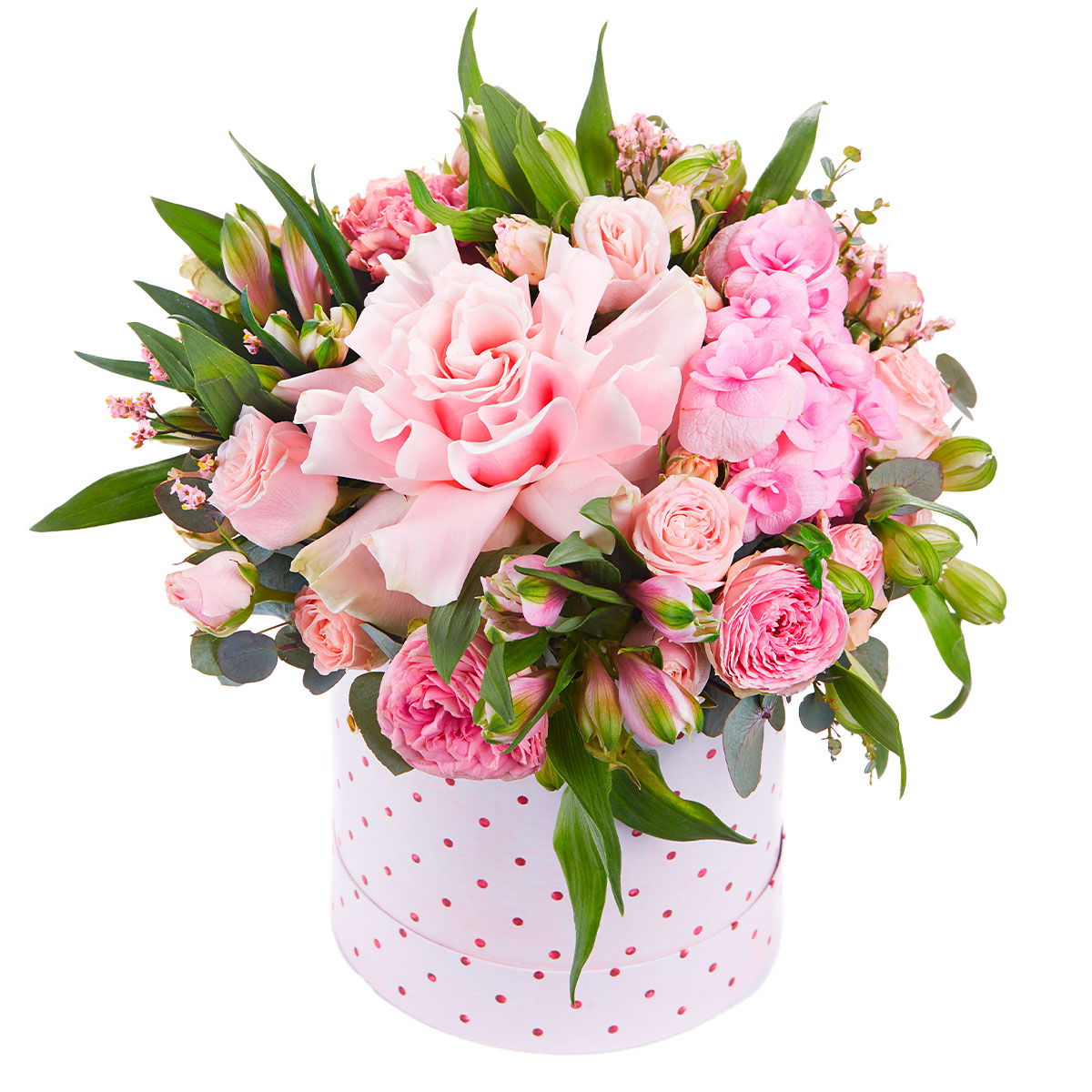 Роза одноголовая розовая, гортензия розовая, роза кустовая пионовидная розовая, альстромерия розовая, эвкалипт. Упаковка (шляпная коробка, квадратный бокс, коробка сердце, оазис)