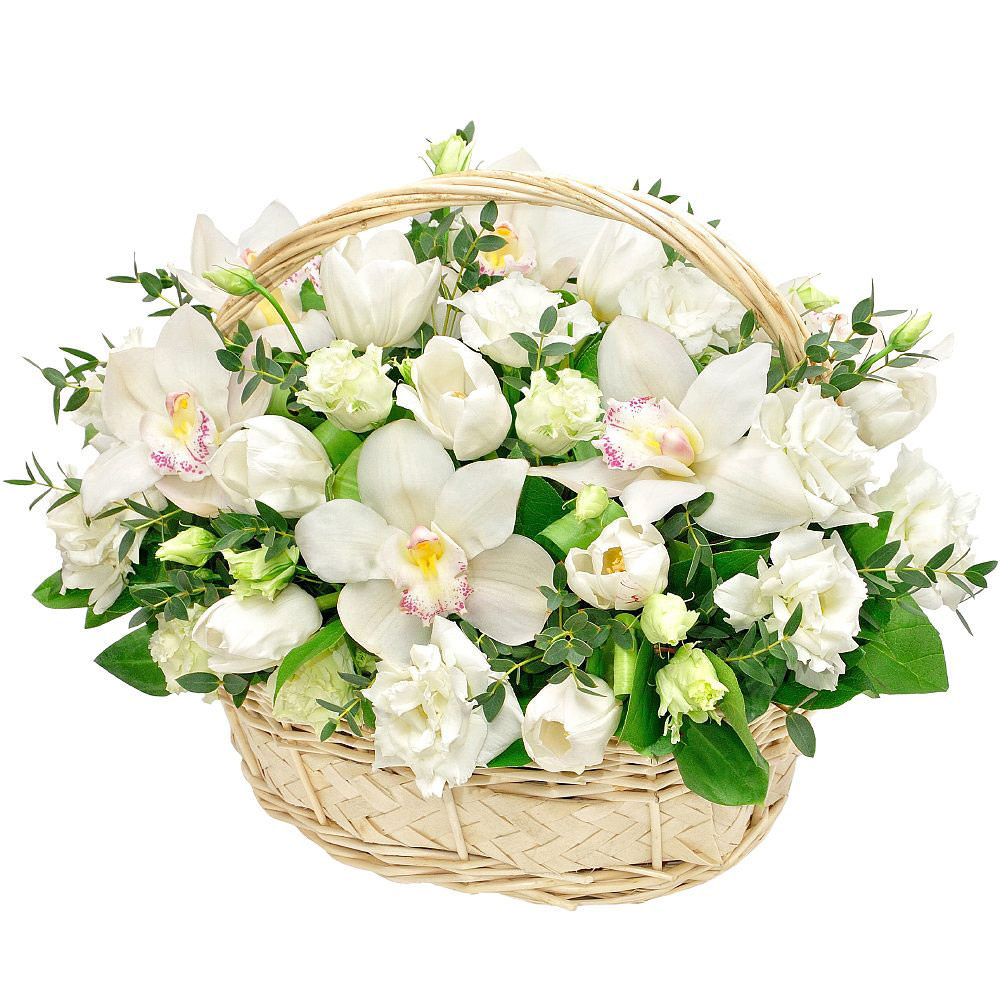 Эустома белая, тюльпан белый, орхидея белая, зелень. Упаковка (Корзина, оазис).