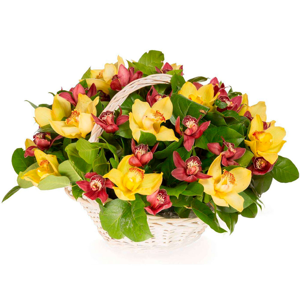 Орхидея микс (желтая, красная), зелень. Упаковка (Корзина, оазис).